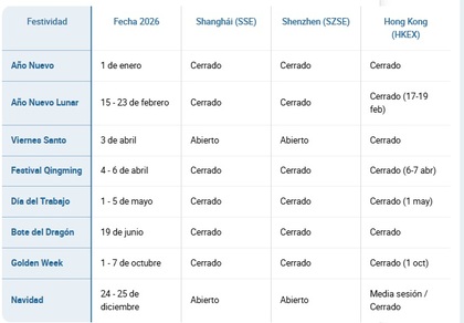 Nota importante: En China, si un festivo cae en fin de semana, se suelen designar días laborables de compensación. Sin embargo, las bolsas nunca abren en sábado o domingo, aunque el gobierno declare esos días como laborables para las oficinas.