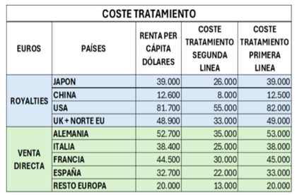Mi duda se centra en las cifras de la última columna. De la lectura del post parece deducirse que es el coste del tratamiento de primera línea referido solo a Zepzelca. Por consiguiente habría que añadir el coste del Atezo. La conclusión sería que el coste total del Mantenimiento de 1L sería casi el doble de las cifras reportadas en la última columna, por lo que la medicación basada en el "combo" Lurbi-Atezo sería tan costosa que las sanidades públicas de los distintos países europeos no la aprobarían por su inviabilidad desde el punto de vista “coste-beneficio”. Casi estoy por asegurar que esta conclusión es errónea, pero me gustaría conocer el motivo. A ver si alguien me lo puede aclarar.