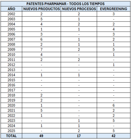 Patentes de nuevo productos: Estas son las familias de productos patentadas. Muchas de esas patentes incluyen centenares de compuestos, aunque en la práctica luego solo se estudien para clínica alguno de ellos. Con las ectes se han estudiado 4 de un total de cientos que hay. Con PM534, solo está en estudio uno de ellos, aunque la patente incluye 300 compuestos.