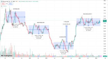 👉 Esto encaja perfectamente con el modelo teórico de Wyckoff Method (acumulación, markup, reacumulación, etc.).