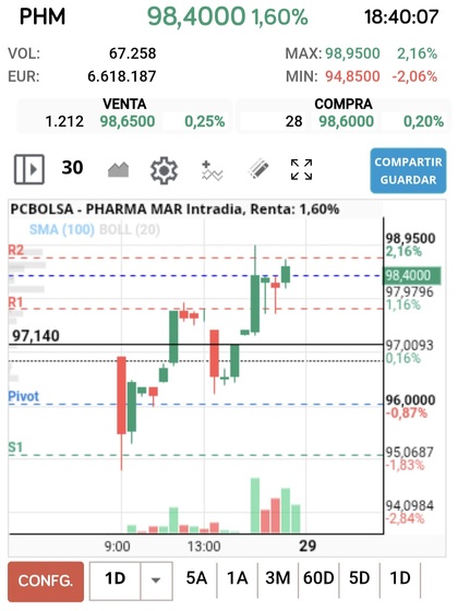 Buenas tardes. Jornada interesante. Graf de 30 min ha dejado un pequeño Gap en 97,14 que mañana cerrará. También ha habido un intento de bajarla (vela roja 16.30/17.00) pero han aparacido compras. La acción esta fuerte. Mañana resultados al cierre. Creo que mañana Miercoles subirá igual vemos los 100 porque parece que va a presentar buenos datos de evolución de ventas y se están descontando. El jueves corregirá dentro del valor alcista. OPINO.
