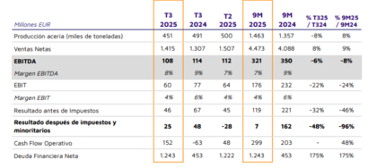 El resultado bruto de explotación (Ebitda) del fabricante de acero alcanzó los 321 millones de euros entre enero y septiembre, un 8% menos que en el mismo periodo del año pasado.