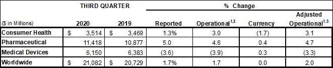 Medical Devices worldwide operational sales, excluding the net impact of acquisitions and divestitures, declined by 3.3%*. The decline was primarily driven by the negative impact of the COVID-19 pandemic and the associated deferral of medical procedures to our Surgery, Orthopaedics, and Vision businesses. Results reflect market recovery versus the second quarter. The decline was partially offset by growth in the Interventional Solutions business led by electrophysiology products.